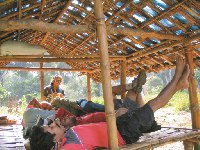 Deep into the forest we find a small thatched bamboo structure with no walls. We wonder why this has been made. Maybe to guard the pineapple orchards. But for now it could be the perfect respite for us. We lie on the bamboo floor. The trees, the green, the poignant smell of the forest, the humming of the birds, the deep blue sky peeking through the foliage, the tranquility, the muted beauty, all these make us drowsy and softly we drift into sleep.