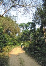 ACross the road from the Ramgar Horticulture Centre stands a deep lush green forest. We find a narrow dirt road to follow. It is a much trodden path as the trampled pattern of the grass shows. Tall Shal trees frill the road.