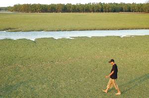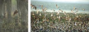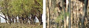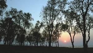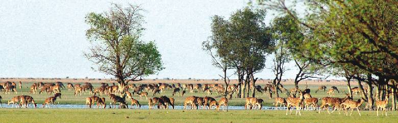 As we turned back, a bright yellow flashed past our eyes -- a pair of hoopoe birds. They landed behind a bush, we approached cautiously with our camera held ready. Slowly we peeked over the bush and found them picking food on the ground. As our camera clicked and the motor rolled, they became aware of us and instantly spread their crest in a show of anger. Then they flew off. We came back to the boat, satisfied; and the journey began. Canals after canals we left behind, it all looked so similar to the Sundarbans, the same kewra and gewa trees, the same breathing roots, the same kind of canals and the beacon of the deer herds. Of course, the tiger was missing. Soon, the canals ended and we came upon the sea. We were left breathless by the beauty of the place, on one side of the sea was the forest -- tall trees frilling the shore that had sharply angled away like the end of a hairpin. On the other side was the open sea, a few fishing trawlers bobbing on the gentle wave. The slanting sun spread a golden ray on the sea gulls cackling in low flights. We moored and went ashore. We walked slowly through the forest for about half an hour to come to the edge of the woodland. In front of us awaited an amazing scene. A huge green field as smooth as a carpet rolled out ahead of us, I have never seen a field as large and green as this one before. On one side of the field was the sea where thousands of gulls were happily fishing. A beautiful stream, golden in its reflection of the sun, had divided the field in half, snaking onto the sea. By the stream were two trees standing tall, adding more loneliness to this lonely field. It all looked like a huge slab of malachite through which ran stream of diamond. At the end of the field started the forest again, and the sight here almost stopped our heart. What were those things there, brown and blurry in the distance? Khosru was the first to lift the binoculars to his eyes and whistled softly. "Deer," he murmured. "Thousands of them."