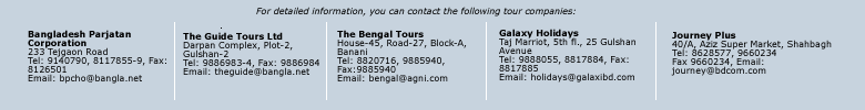 The state-owned tourist organization, Parjatan Corporation, does not conduct tours during the Ramadan. But they have some good accommodations in remote areas which you can hire as your base camp. The private tour operators such as Guide Tours Ltd, Bengal Tours Ltd, Galaxy Holiday and Journey Plus offer some Eid-holiday packages. Interested holidaymakers can contact them in advance.