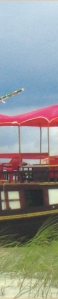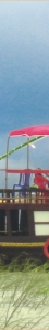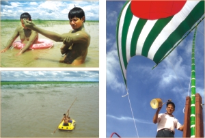 We were cruising on the smaller branch of the river but strong wind created huge waves that rocked our boat. Though we had some life jackets, the waves made some of us a bit worried. But soon the worrying time was over and all of us started singing suppressing the whirring of the engine. Mr Alam and Mr Maroof of JABA Tours, our host of the trip, were always busy looking after us. Soon then joined the chorus. The weather was not photographer-friendly as most of them hate such lighting condition, but surely it was perfect for the outdoor-loving tourists. The condition was ideal for the autumn Padma landscape as if came out of poems of Tagore who used to spent quite a long time on the river. Apart from the mechanised boats, small dinghis were plying here and there. The colour of sky and water became dirty gray and the horizon could only be defined by the lines of lush green vegetation. After an hour or so, out boat anchored at the junction of the main course of the river with strong currents. It was time for swimming but the level difference of boat and water made it difficult to drop into the water. Fortunately, Inam volunteered by dropping his inflated boat into the water. Alam dropped down some lifebuoys entangled by a strong rope for the relief of the tired swimmers. One must admit that swimming in swimming pools and free flowing water is always a different experience. Suddenly clouds disappeared and an intense blue sky with brilliant sunlight came out from nowhere. We did not waste time to enjoy the magical moments. We got to swimming, mud-bathing, squeezing through the paddy and jute vegetations and everything that came to our brain. We were tired to our bones and our stomach persuading us to call it the fun. We obliged.