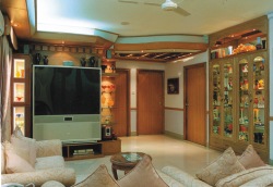The false ceiling bears interesting ornamentation. Burnt art pieces hang from it, illuminated by spotlights. The rest of the family space continues uninterrupted, up to the family's bedroom. As dusk-time arrives, this entertainment comes alive with music, entertainment, and the family settles in to enjoy some quiet moments in luxurious coziness.
