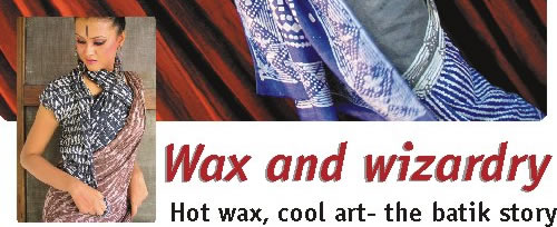 "There are different ways of doing batik. You can use blocks, which you dip in hot melted wax and stamp on sari, after waxing, the cloth will go for a dye bath, once done you get to see the crackle effect. This is the method I use. I personally prefer to use vegetable dyes but also use chemical dyes if I am asked to."