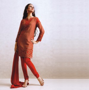 Keeping with the fiery theme, Dressy Dale's collection for Eid comprises dresses, tunics and shalwar sets in bright, bold shades of red. From intricately embroidered shalwar kameezes in rich ruby to peasant-inspired tunics in devil red and black, to long sleeved long dresses in a cheery tomato shade, the red line traverses a wide spectrum of shades. Variation is wrought by means of embellishments, cut, and fabrics. The slim silhouette, with the high waistline seems to be predominant in this collection, and churidars are back in a big way.