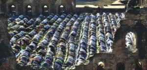 Indian Muslims offer Eid al-Fitr prayers inside the Feroj Shah Kotla masjid (mosque) in New Delhi, 26 November 2003. Muslims around the world celebrate Eid al-Fitr which marks the end of the holy fasting month of ramadan.