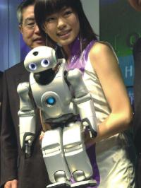 A model display a Sony's robot 'Qrio' during a computer show at World Trade Center in Taipei 29 November 2003. More the 1,800 booths from 350 companies are here to demonstrate their latest laptops, PDA, PC and softwares for a nine-day exhibition.