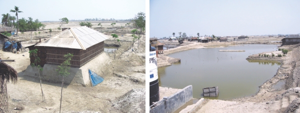 A Dying Landscape Fuad H Mallick Grey is what would describe the landscape. Not the colour, but Grey, as in desolate, unresponsive and lifeless. Miles and miles stretch out where the earth refuses to let anything grow. All that is left are a few scraggly trees and shrubs here and there, reminiscent of a life that once proliferated. Houses and huts, although some new, are devoid of the expected surrounding greenery. Hopelessness on people’s faces, betrayed by nature and a soil that once gave them life, now dying. Three years after cyclone Aila hit the south west coast of the country, the land and community is far from recovering from its aftermath. Along with high winds came a storm surge that broke through the embankments and flooded the land with saline water. Shrimp farming had already made parts of the land unsuitable for cultivation and whatever remained has been made saline. Land where paddy once grew now yields none. There is water all around but like a Coleridgeian nightmare, not suitable for drinking. To make it drinkable, a lengthy filtration process is needed. No crops grow and there are hardly any cattle. People eke out an existence from almost nothing. Some were collecting wet leaves brought in with the tide, to dry them in the sun and later use them for cooking.