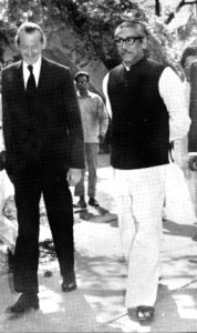 To gauge the extent of these changes one has only to recall that the first Foreign Minister to visit Dacca (as it was then spelt), the capital of the newly emerged Bangladesh, was Otto Winzer of the German Democratic Republic -- a country since reunified with West Germany -- and that one of the much trumpeted first visits of a Head of State to Bangladesh was that of President Tito of Yugoslavia, then regarded as a great leader of the non-aligned world. Another instance of these vast changes can be that Sheikh Mujib's first ever official visit abroad took him to the late, but not much lamented, Union of the Soviet Socialist Republics (USSR). He traveled to Moscow with technical stopovers in Bombay (now Mumbai) and Tbilisi, of the then Soviet State of Georgia, now the capital of an independent country. Likewise, he traveled back to Dhaka from Leningrad (now St. Petersburg) via Tashkent of the then Soviet Union, which is now the capital of an independent Uzbekistan. Bangladesh Biman then possessed no long-range aircraft (not that it does so now in any dependable measure!) and these stopovers were necessary as no direct flight from Dhaka to Moscow, carrying a Head of State, was considered advisable in the poorly pressurized Ilyushin18 aircraft lent by the Kosygin government for the visit. After the Second World War, with the fall of colonialism, many new nations were born on the continents of Asia and Africa. Leaders of those nations, for instance, Nehru, Jinnah, Nkrumah, Sukarno and the like, had, during the period before the independence of their countries, the opportunity to deliberate on the likely foreign policy blueprint for their respective countries. But Bangladesh's appearance in the world map was so sudden and dramatic that under those circumstances it was not possible to indulge in any concrete thinking in that area in the much divided, and acrimonious, bipolar world of the day. Before the war of liberation, as the leader of the Awami League, the thoughts that Sheikh Mujib had expressed from time to time regarding foreign policy were largely in the context of a united Pakistan. This is, however, not to say that even in those days he did not have East Pakistan's transformation into an independent nation in mind. "The American Papers," a document released by the US State Department at the expiry of their Official Secrecy Period, bears out this point. Joseph Farland, US Ambassador in Islamabad, in a message on the state of Pakistan, in November 1969, referred to Sheikh Mujib as "the uncrowned king of East Pakistan." In a statement sent in January,1971,