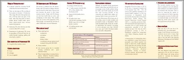 Dr. K. Zaman, Scientist/ Epidemiologist, ICDDR,B: ICDDR, B collaborates with NTP and BRAC on health issues. We need precise information about TB from both urban and rural areas. Prevalence of TB is a major issue in Bangladesh. It has been observed that about 95 persons out of 100 thousand (100,000) are infected by TB (research was conducted on a population of those over 15 years of age) in some specific areas. The diagnosis of children with TB is difficult because they cannot produce sputum.