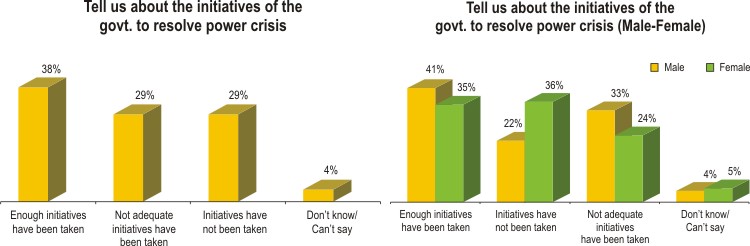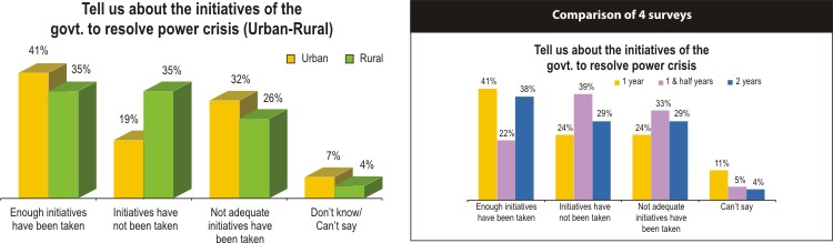 Power remains a weak spot of the government as more people now think not enough has been done to alleviate the power crisis. When the government completed its first year, 41 percent thought enough initiatives had been taken. Two years after, 38 percent think so. On the other hand, 24 percent then thought initiatives had not been taken, today 29 percent think so. Back then 24 percent found the initiatives not enough and today 29 percent think so. Males and urban dwellers gave the government good scores on power.