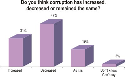 People who think corruption decreased after two years have outnumbered those who think it increased. The survey showed 47 percent respondents think graft decreased against 31 percent who think it increased. 19 percent think it remains as before.