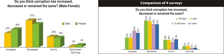 However, when compared with the previous three polls, it was found that more people now think that corruption increased over the last two years while a lesser number of people think it decreased. One year ago, 22 percent thought corruption increased and now they are 31 percent. A lesser percentage of people think corruption decreased. One year ago, 54 percent thought corruption decreased and now they are 47 percent. Females were found to be especially critical about the corruption situation as 34 percent of them against 27 percent of the males thought graft increased.