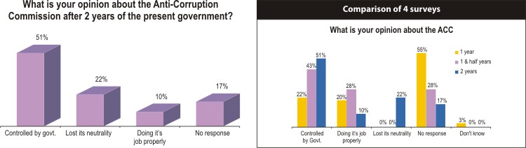 At the same time, more people have a negative impression about the Anti-corruption Commission. Some 51 percent said they think ACC is controlled by the government while 22 percent think it lost its neutrality. Only 10 percent think it is working properly.