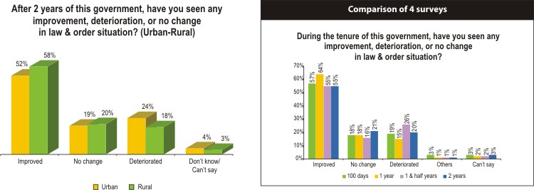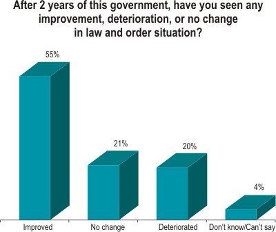 The majority of respondents are happy with the law and order situation as they were two years ago. When the government crossed its first 100 days, 57 percent thought the law and order situation had improved, two years down the lane 55 percent still think so. More people were happy about law and order one year ago, as 64 percent back then said they found an improvement. Rural people gave a better rating to law and order situation.