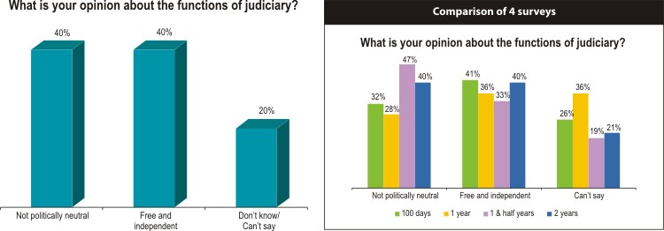 Two years after the government was formed, 40 percent think that the judiciary is not politically neutral while an equal percentage think it is free and independent.