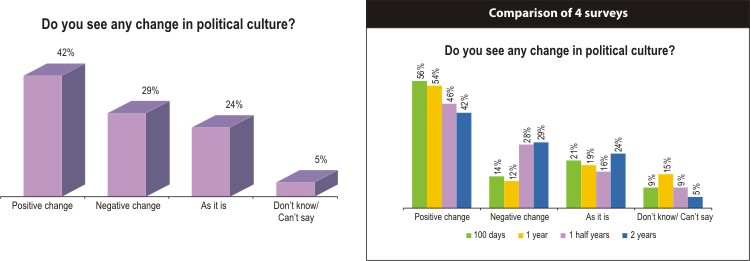 Two years after this government came to power, 42 percent still see a positive change in the political culture, while 29 percent find negative change. Some 24 percent find the political culture as before.