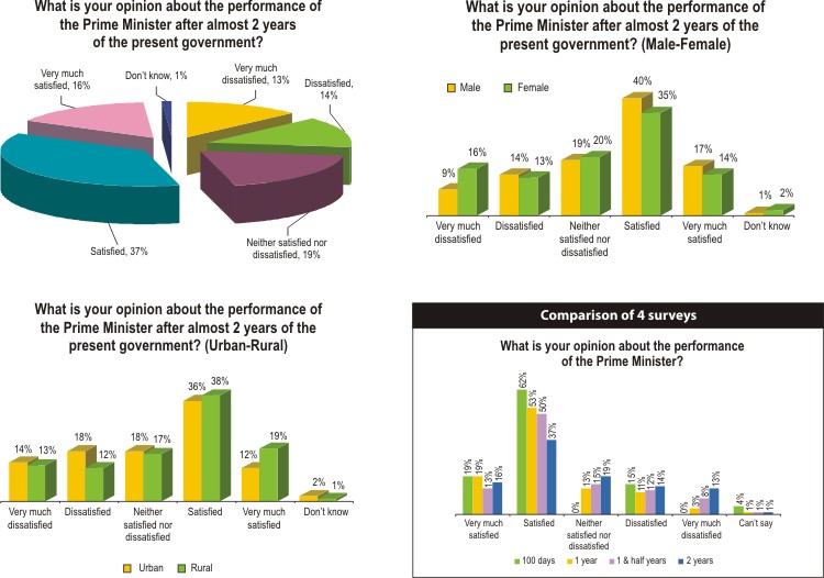 Over a half of the respondents (53 percent) are still satisfied with the performance of Sheikh Hasina as the prime minister. However, her rating dropped quite a bit in the last two years. When Hasina became the prime minister, a huge 81 percent said they were happy with her (62 percent satisfied and 19 percent very much satisfied). A year later, 72 percent said so (53 percent satisfied and 19 percent very much satisfied). One and a half years later this rating went further down to 63 percent. Two years down the line she holds a satisfaction rating of 53 percent (37 percent satisfied and 16 percent very much satisfied). Once again, males and urban people gave Hasina a better rating.