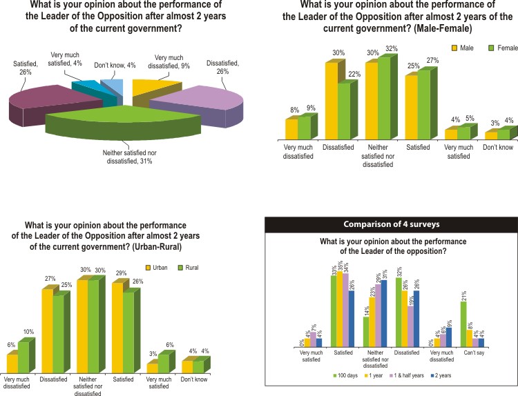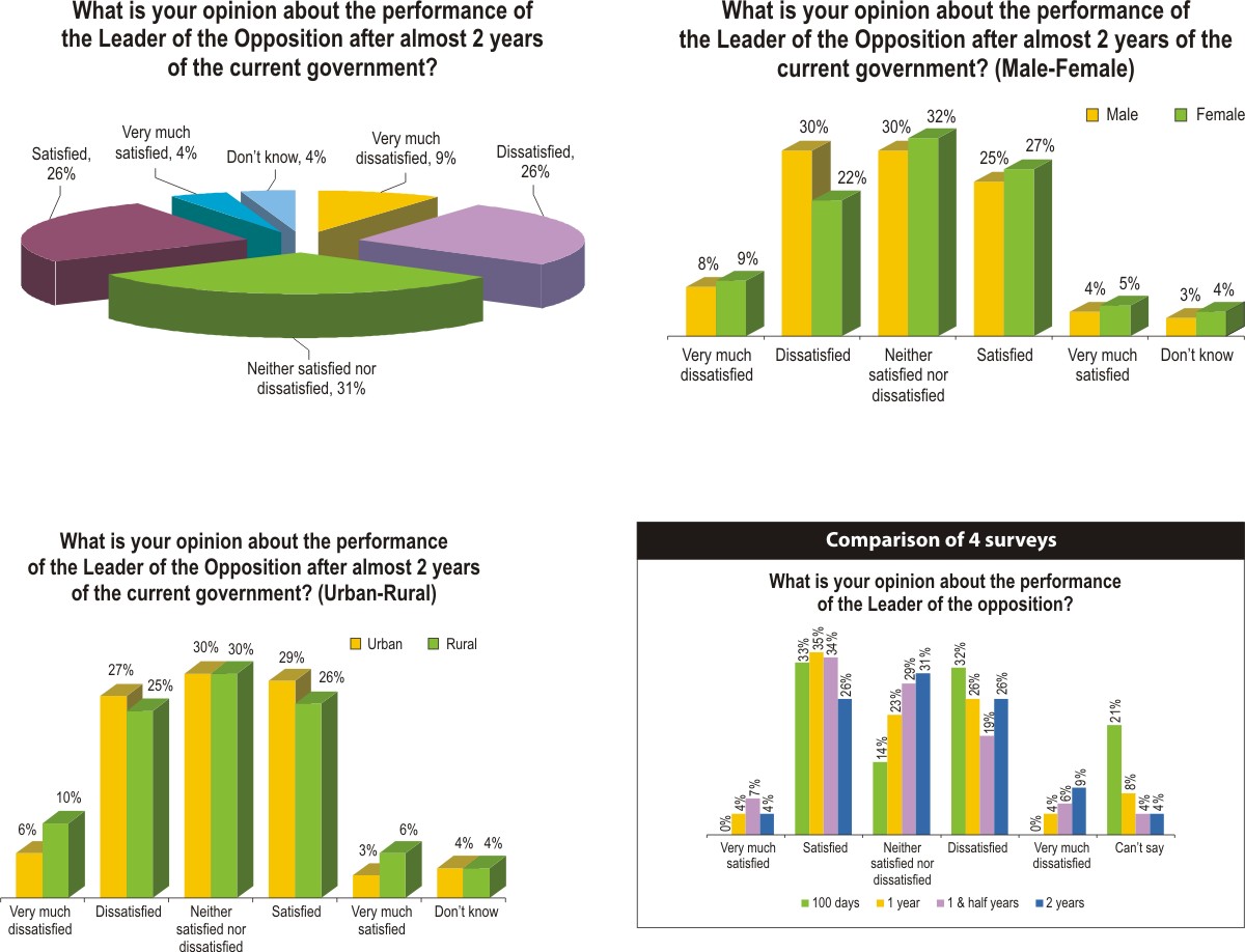 Khaleda Zia's popularity also suffered over the two years and went through a topsy-turvy curve. Two years ago, 33 percent said they were satisfied with her performance. A year later, her popularity improved to 39 percent (35 percent satisfied and 4 percent very much satisfied). One and a half years later, she gained even more popularity, hitting 41 percent (34 percent satisfied and 7 percent very much satisfied). But then her popularity drastically dipped to 30 percent after two years (26 percent satisfied and 4 percent very much satisfied). Females and the urban population were more satisfied with her performance.